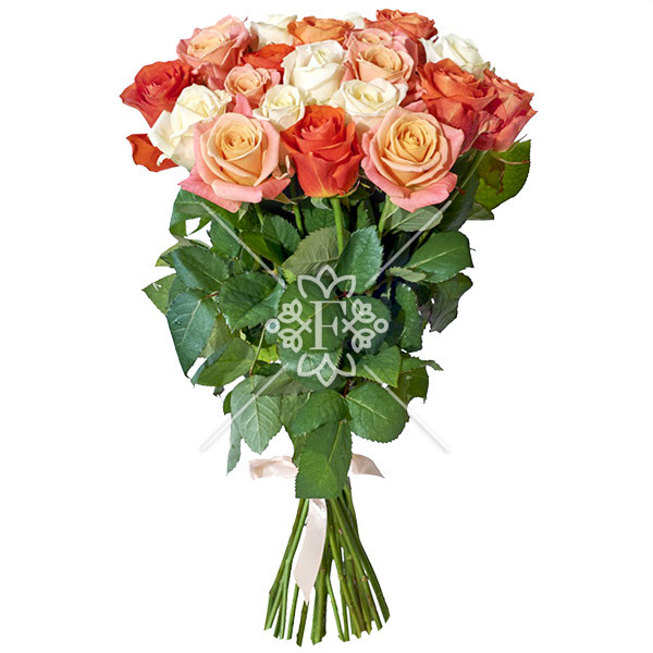 розы разноцветные ( белые, оранжевые, персиковые) - 25 шт., упаковка, лента.